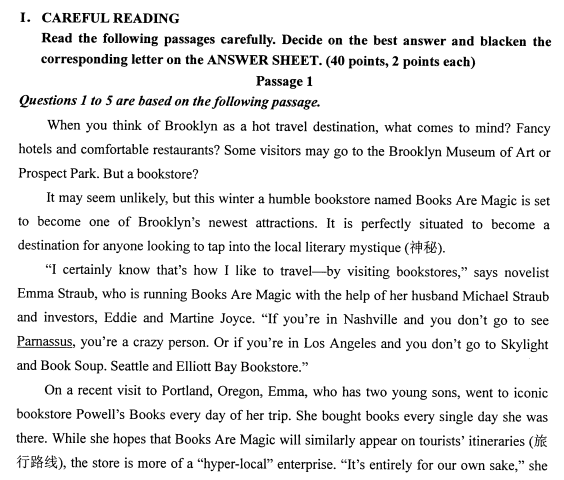 全国2021年10月高等教育自学考试英语阅读(一)试题